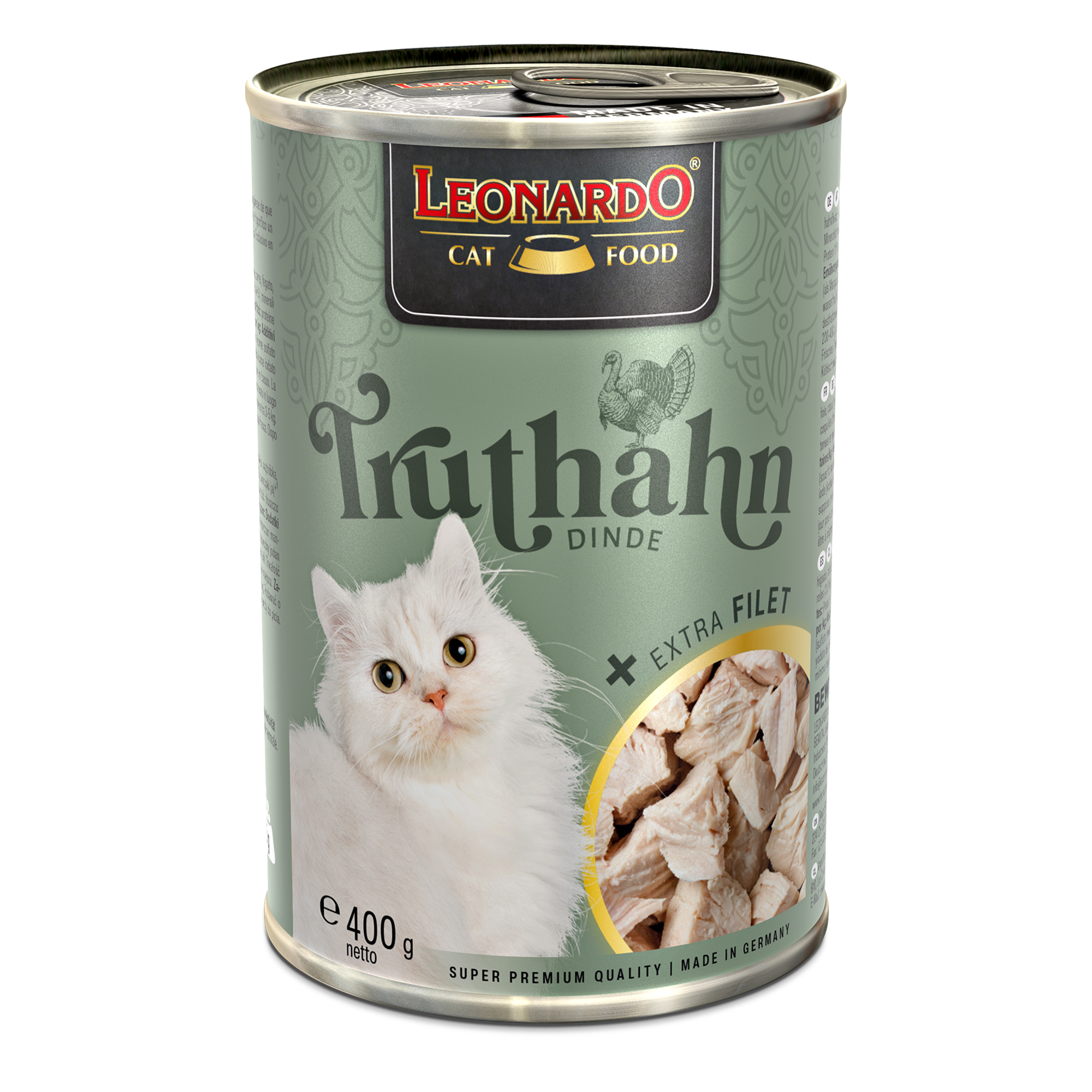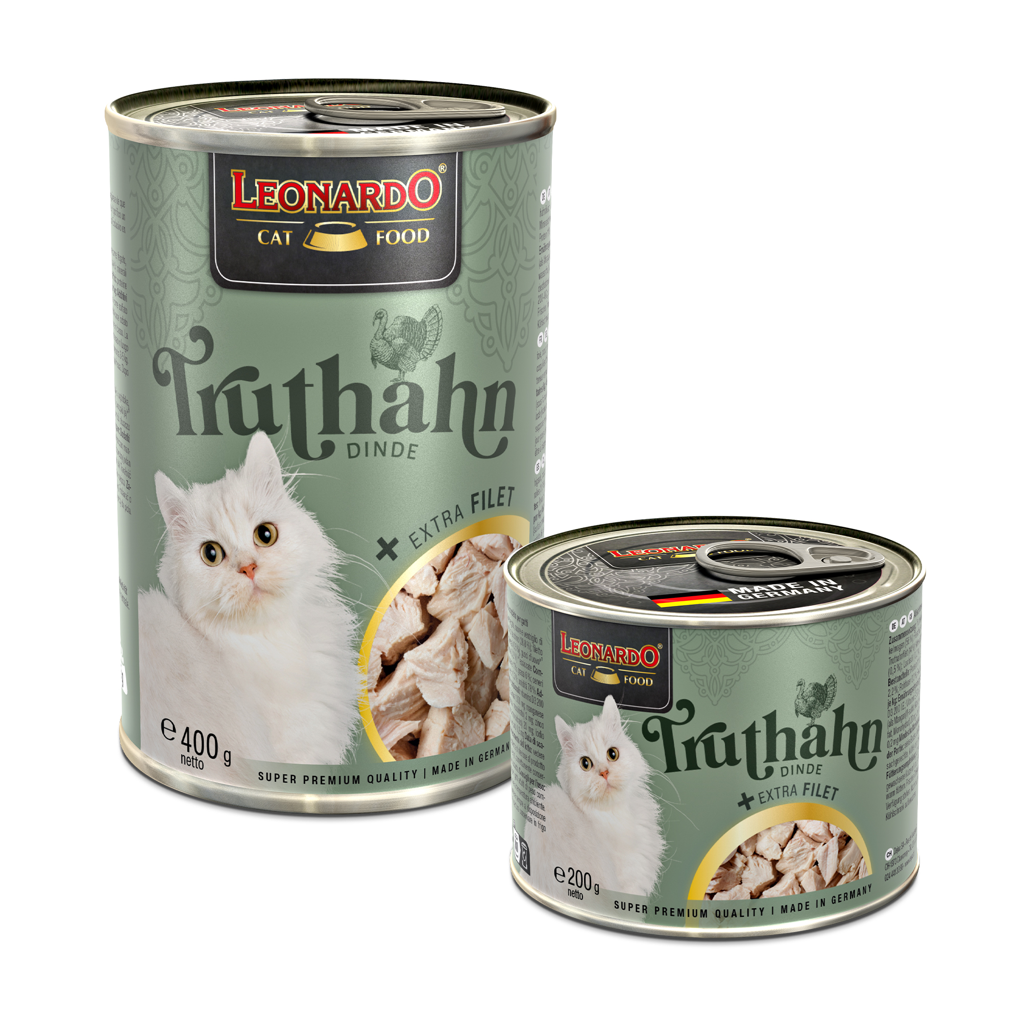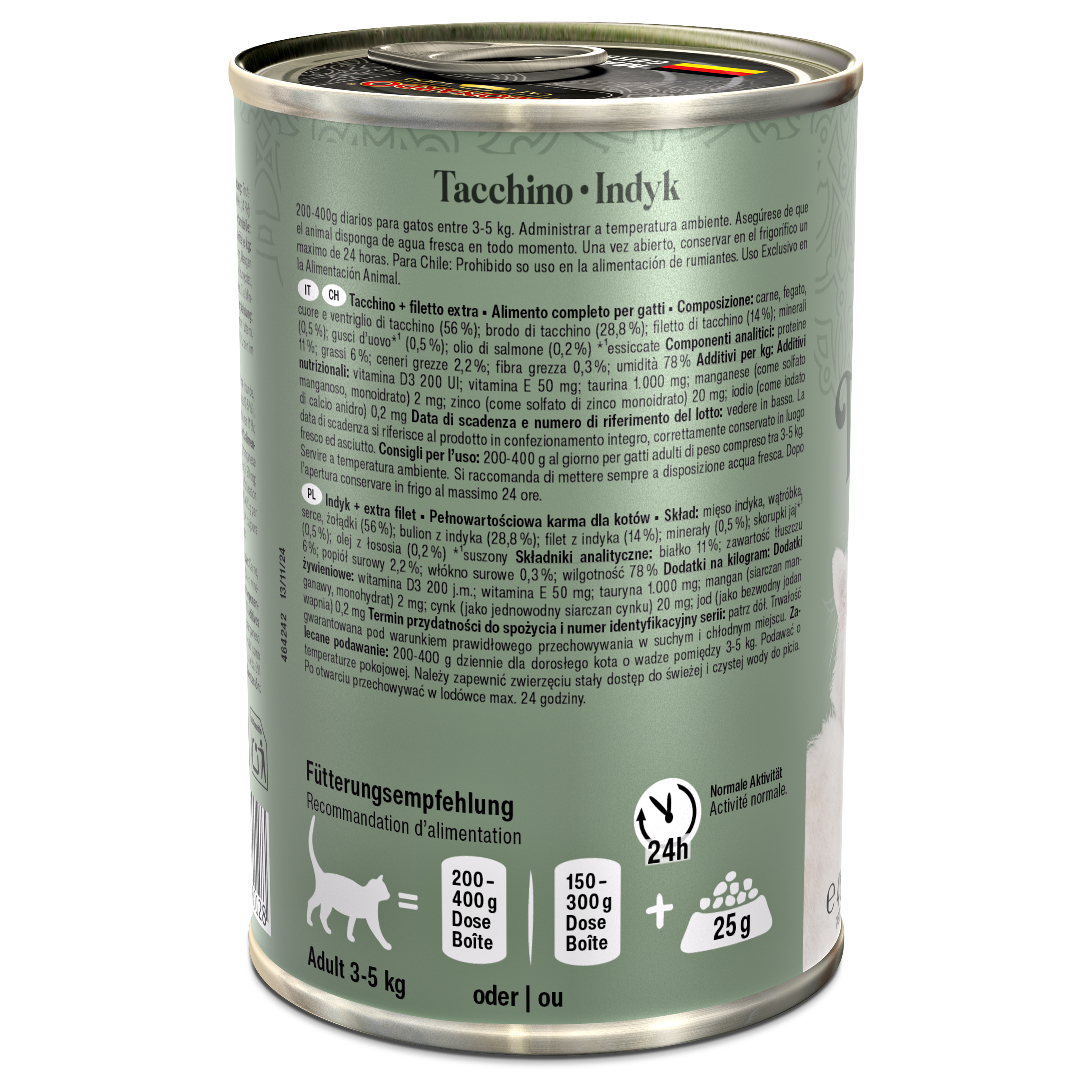 Den store andel af kalkun i prima kvalitet er raffineret med ekstra lækre filetstykker. Skånsomt tilberedt i egen saft, så der udvikles en uimodståelig kødnydelse og en helt særlig glæde ved at tygge. Opskriften får et ekstra afsluttende raffinement med den fineste lakseolie, som også tilfører flerumættede fedtsyrer, der giver silkeblød pels. Naturligvis uden sukker eller kunstige farve- og smagsstoffer samt konserveringsmidler.